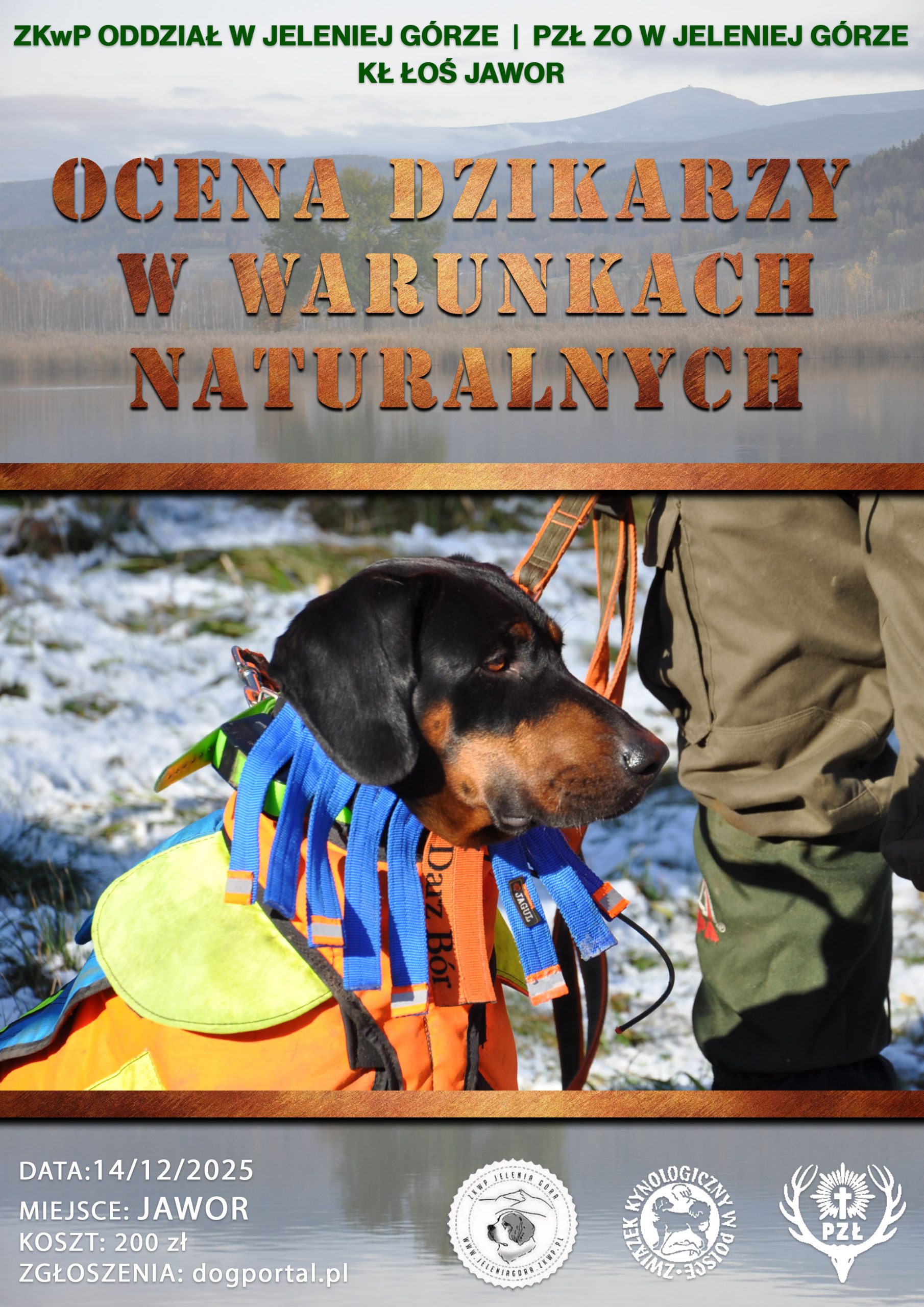 PZŁ Zarząd Okręgowy w Jeleniej Górze, Zkwp oddział w Jeleniej Górze oraz KŁ Łoś Jawor zapraszają na Ocenę Dzikarzy w Warunkach Naturalnych, która odbędzie się w dniu 14.12.2025 w okolicach Jawora.